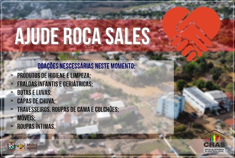 O CRAS, juntamente com a Secretaria Municipal da Assistência Social, a partir de Segunda-Feira (11/09), passarão a arrecadar doações que serão destinadas ao município de Rocas Sales, que foi um dos maiores atingidos pelas inundações dos últimos dias.