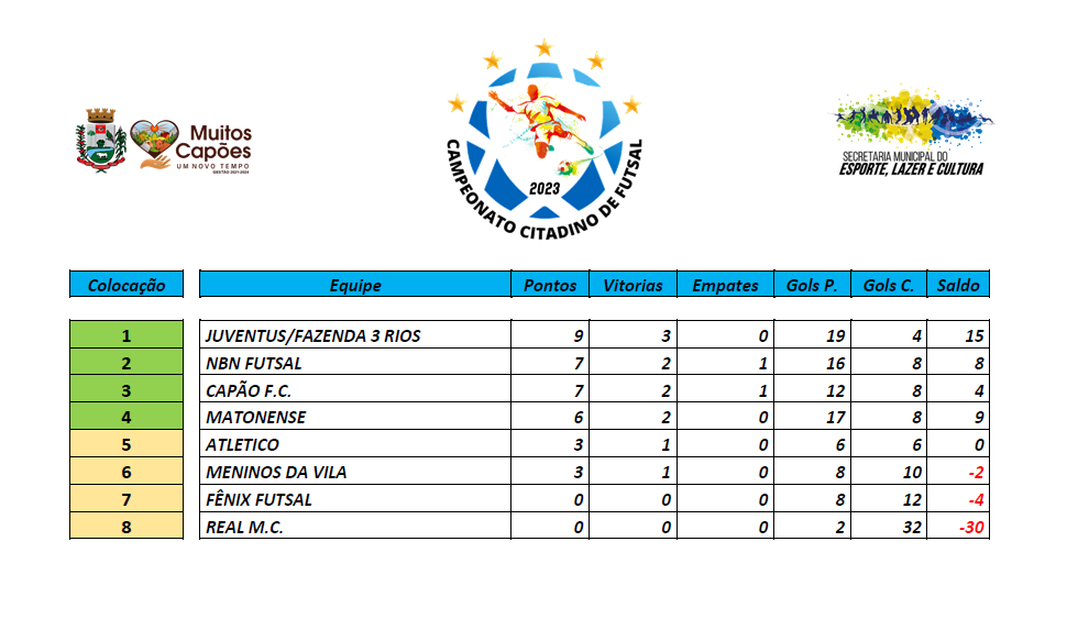CAMPEONATO CITADINO DE FUTSAL 2023 TAÇA JOSÉ DERLY CHAGA Data: 30/11/-0001 Categoria: Secretaria de Esportes, Lazer e Cultura