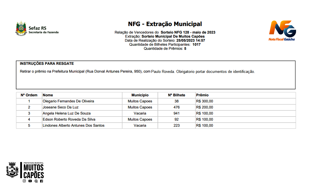 Ganhadores da Nota Fiscal Gaúcha referente ao mês de Maio de 2023.