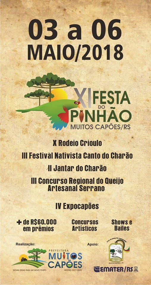 https://www.facebook.com/510846812582167/photos/pcb.636192853380895/636192256714288/?type=3&theater Acesse a página oficial da Prefeitura de Muitos Capões no Facebook e conheça a progração completa da Festa do Pinhão 2018