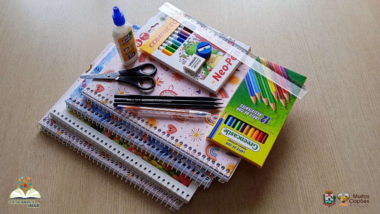 Cadernos, Lápis, Canetas, Apontador, Lápis de Colorir, Canetas de Colorir, Borracha, Cola, Régua, Tesoura, entre outros.