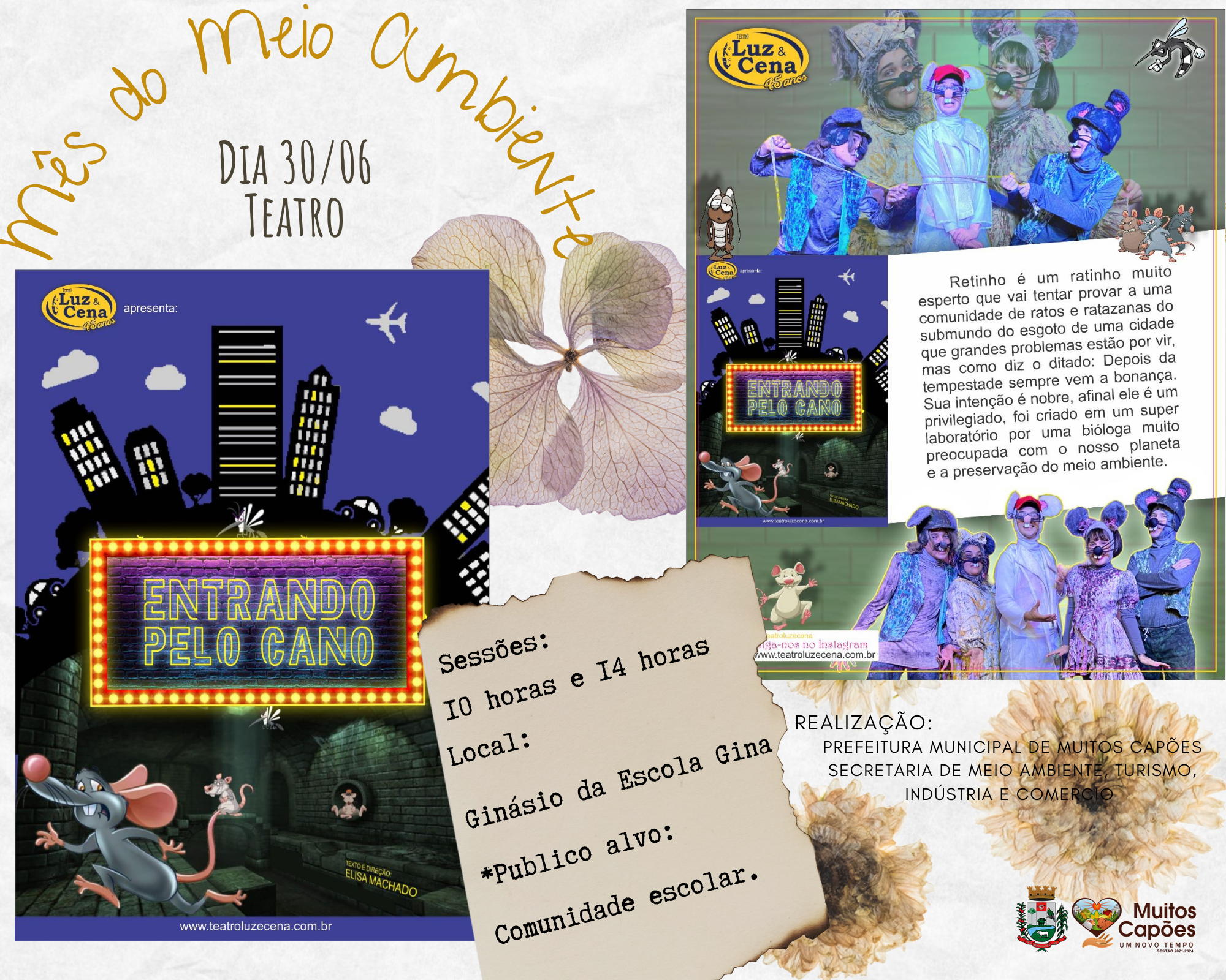 A Secretaria do Meio Ambiente, Turismo, Indústria e Comércio convida toda a comunidade escolar do município para participar do Teatro Luz e Cena com o espetáculo “Entrando pelo Cano”, que será apresentado nesta Sexta-Feira (30/06), no ginásio da Escola Gina Guagnini em duas sessões, sendo a primeira as 10:00 da manhã e a segunda as 14:00 da tarde.